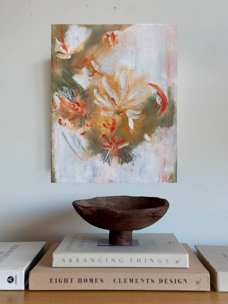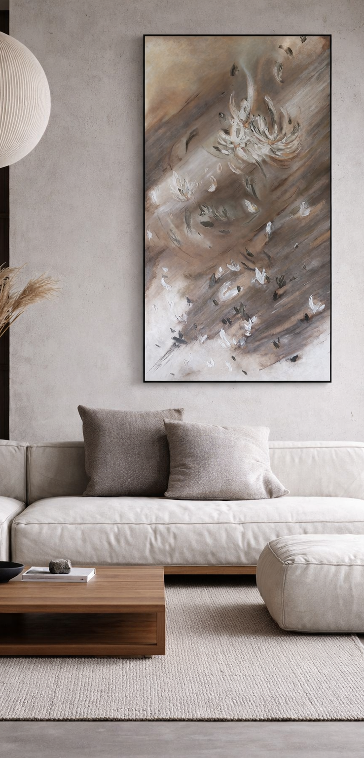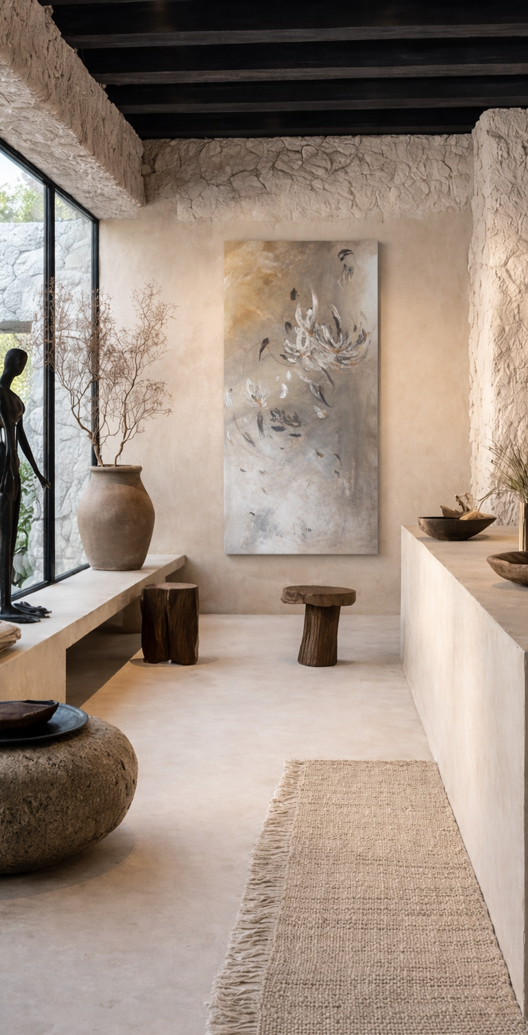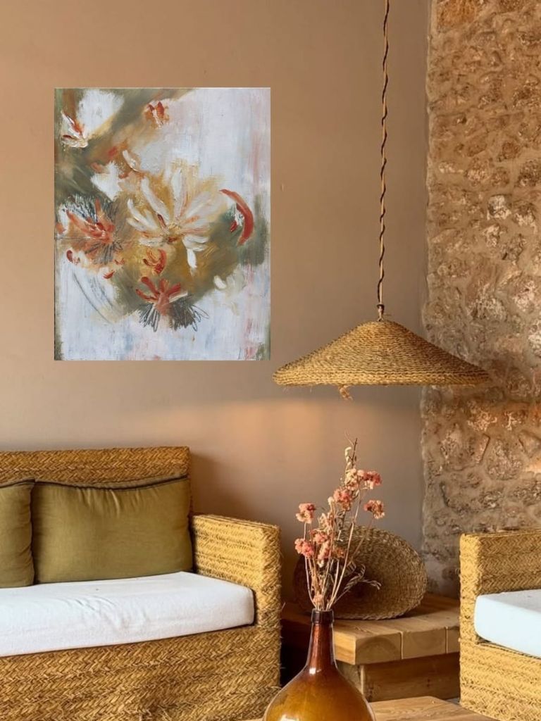 La pintura se vuelve un espacio de pausa y contemplación, un encuentro hacia el interior, donde lo frágil y lo fuerte conviven.