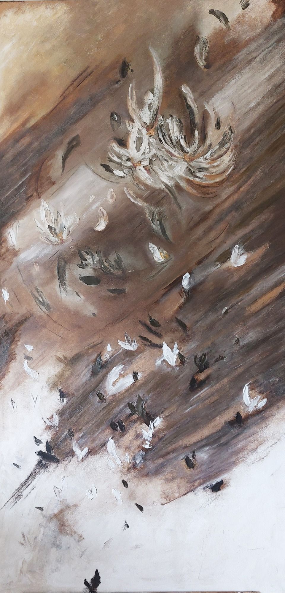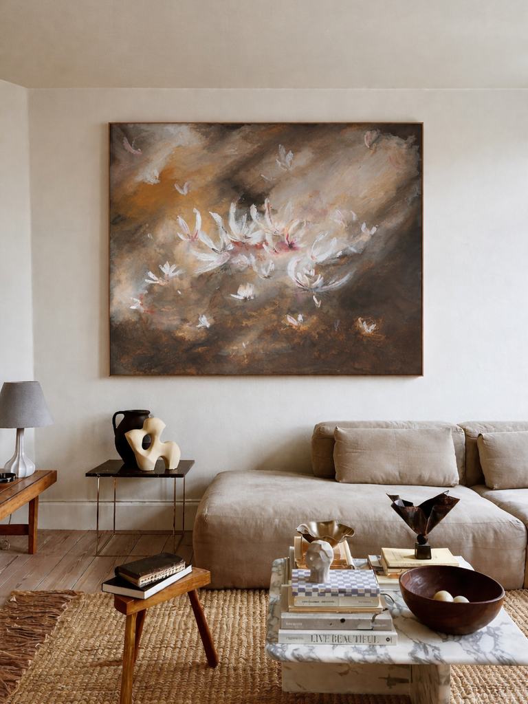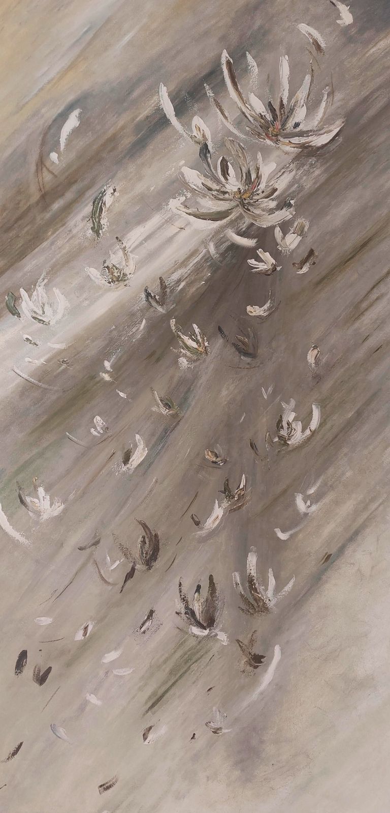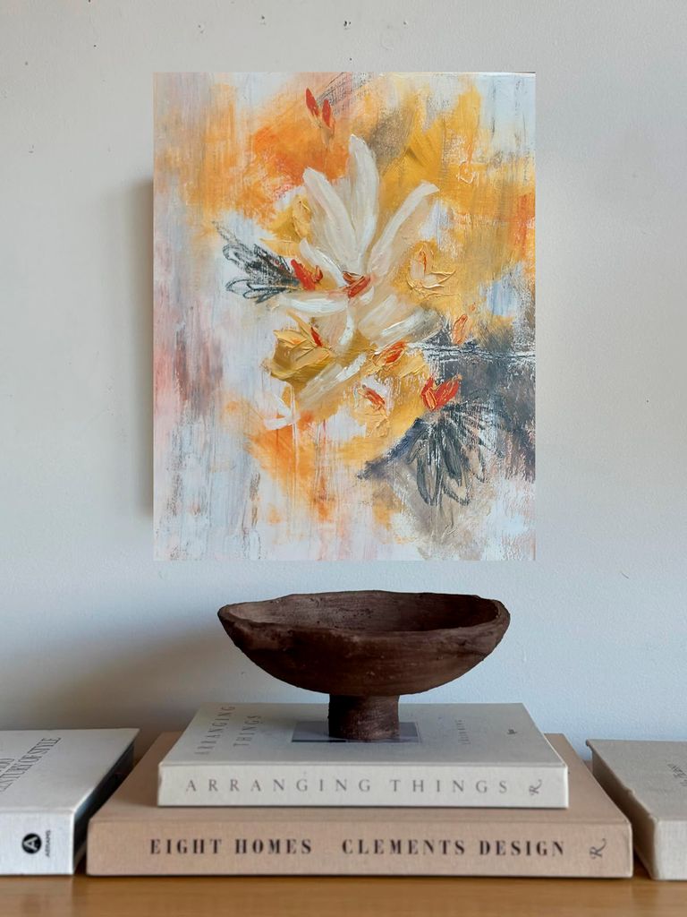 La pintura se vuelve un espacio de pausa y contemplación, un encuentro hacia el interior, donde lo frágil y lo fuerte conviven.